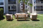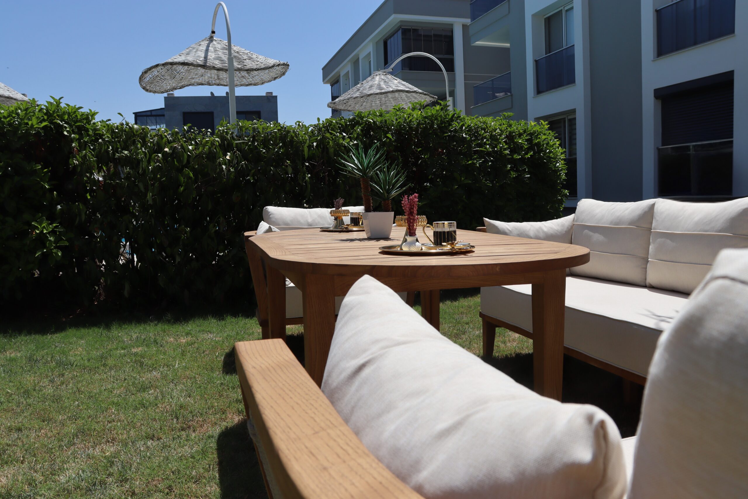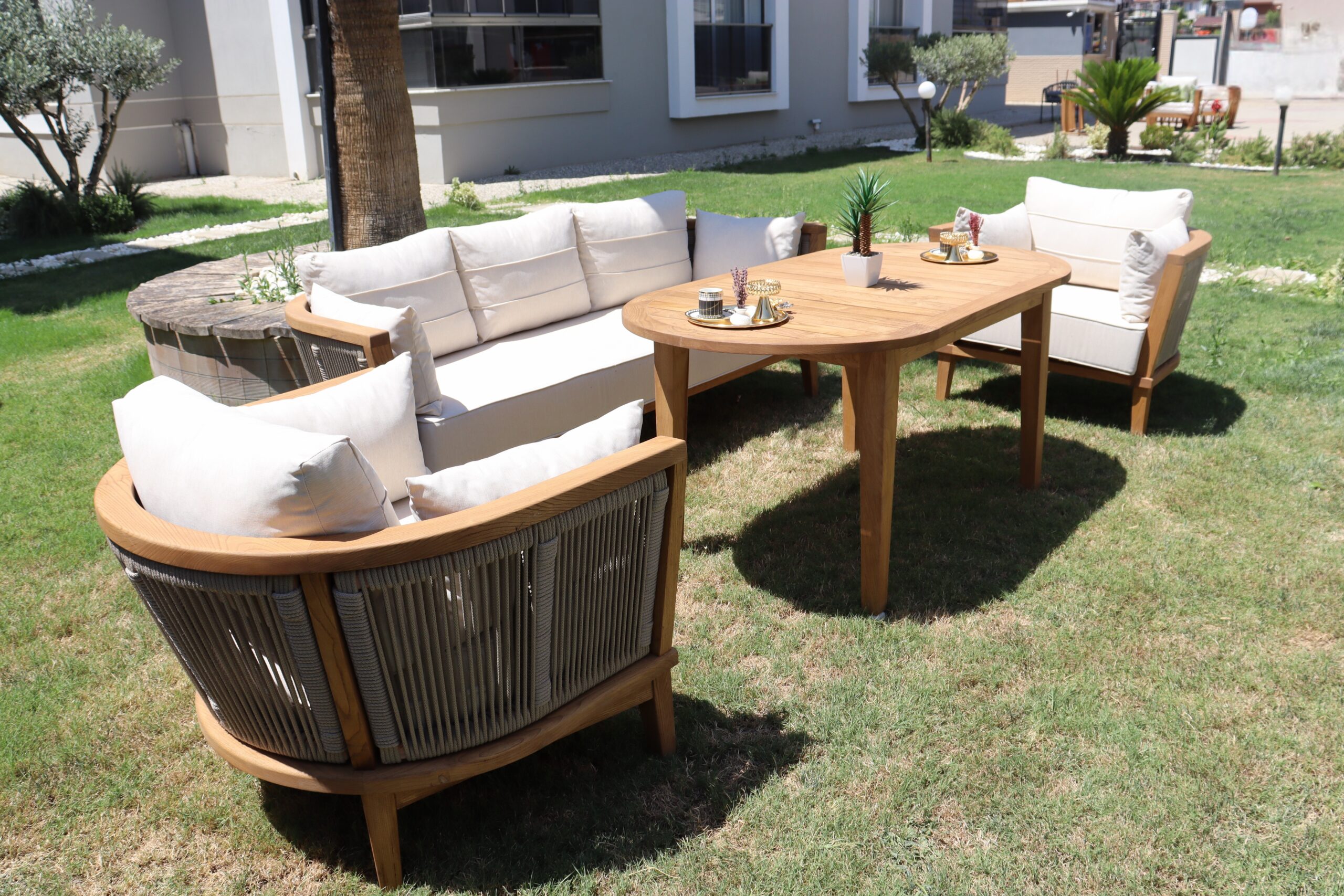 Begonya Ahşap Oturma Grubu, estetik tasarımı ve yüksek konforu bir arada sunuyor. Takım; bir adet 3’lü kanepe, iki adet tekli koltuk ve bir adet masadan oluşuyor. Birinci sınıf fırınlanmış kestane ağacından üretilen gövdesiyle uzun ömürlüdür. %100 Olefin kumaşları su itici özelliğe sahip olup, 3 yıl solmama garantisi sunar. İşbir marka yüksek dansite süngerleri ve silikon sırt minderleriyle ekstra rahatlık sağlar. Tüm hava koşullarına dayanıklı yapısıyla hem şık hem de fonksiyonel bir dış mekân oturma grubudur.
